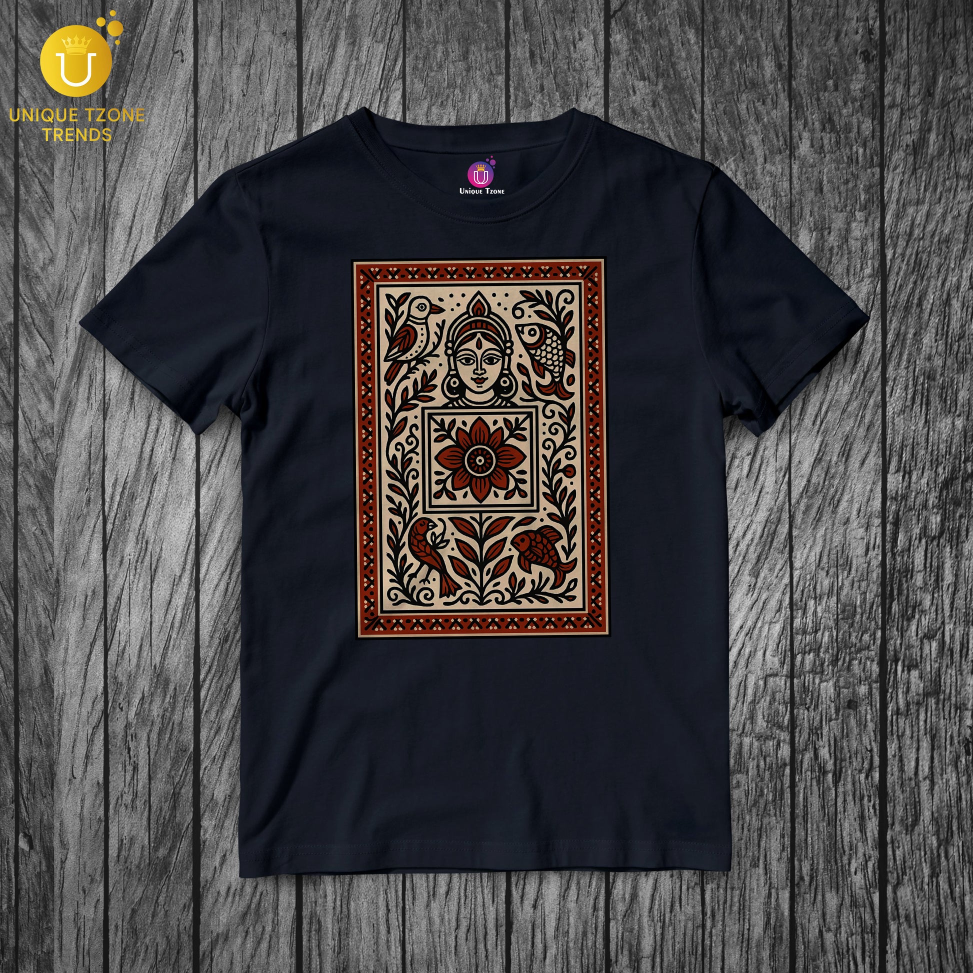Devi Motif Madhubani Pattachitra Folk Art Half Sleeve Round Neck Unisex Pure Cotton Tshirt