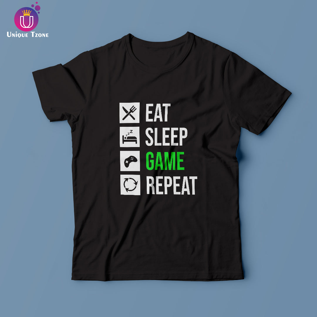 Eat Sleep Game Repeat Black Round Neck Half Sleeve Cotton T-shirt