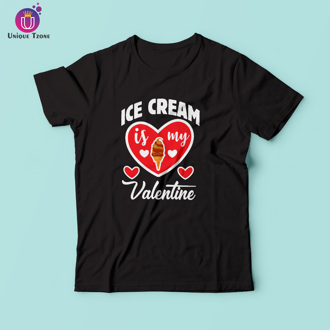 Ice Cream Is My Valentine Black Round Neck Half Sleeve Foodie Cotton T-shirt