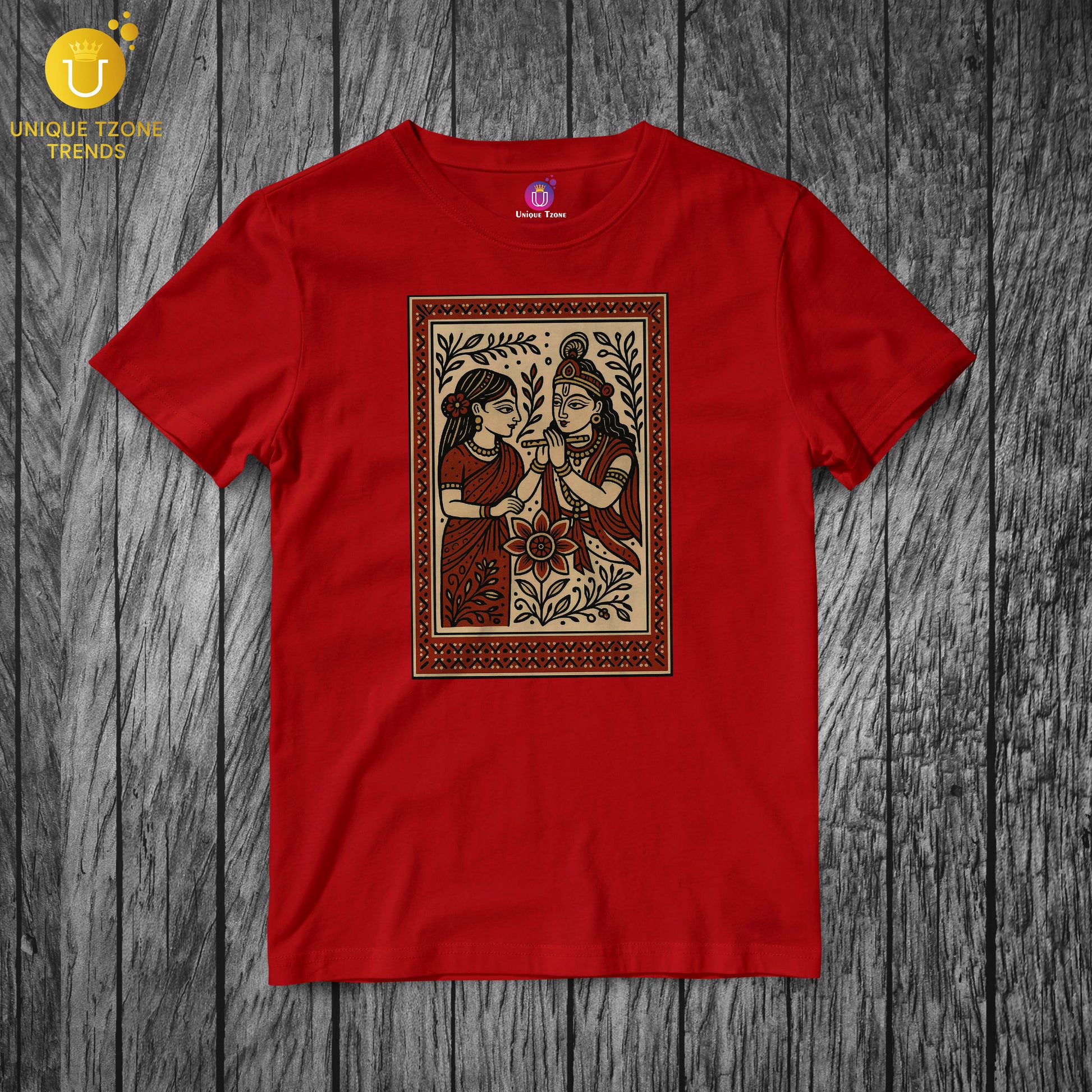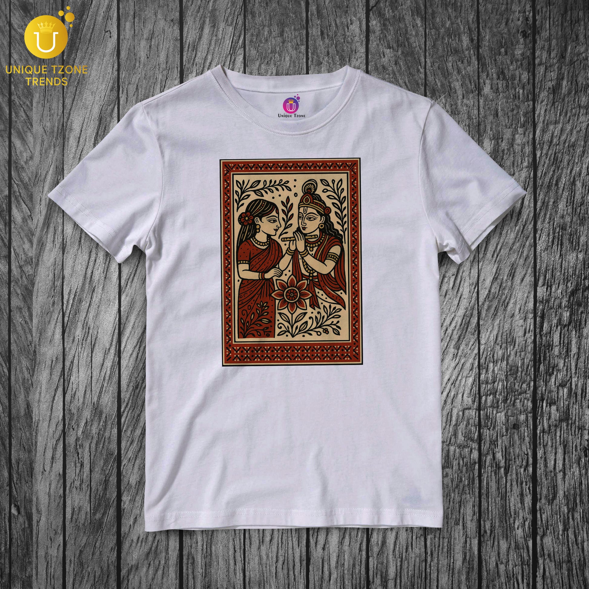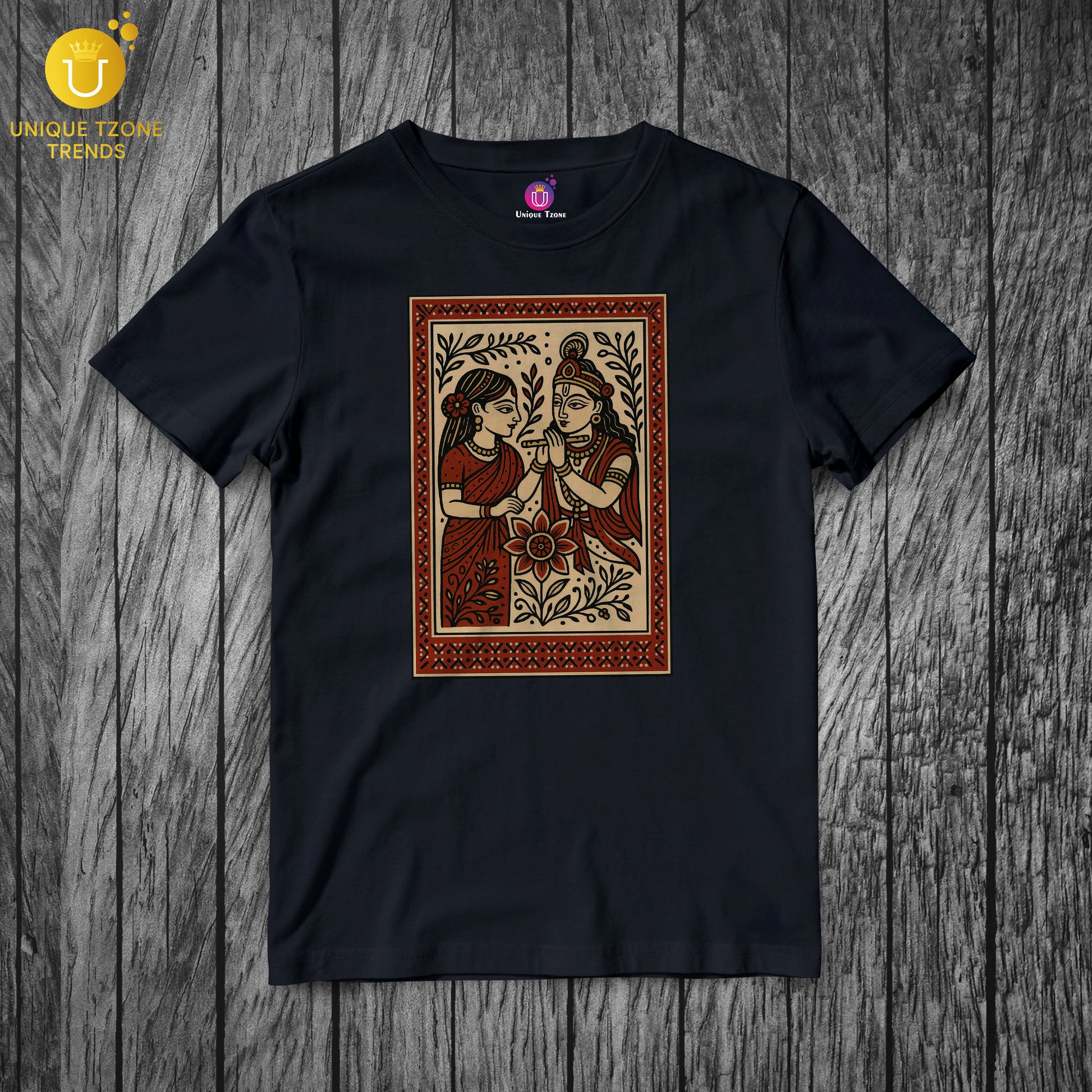 Radha Krishna Pattachitra Madhubani Folk Art Style Half Sleeve Round Neck Unisex Cotton Tshirt